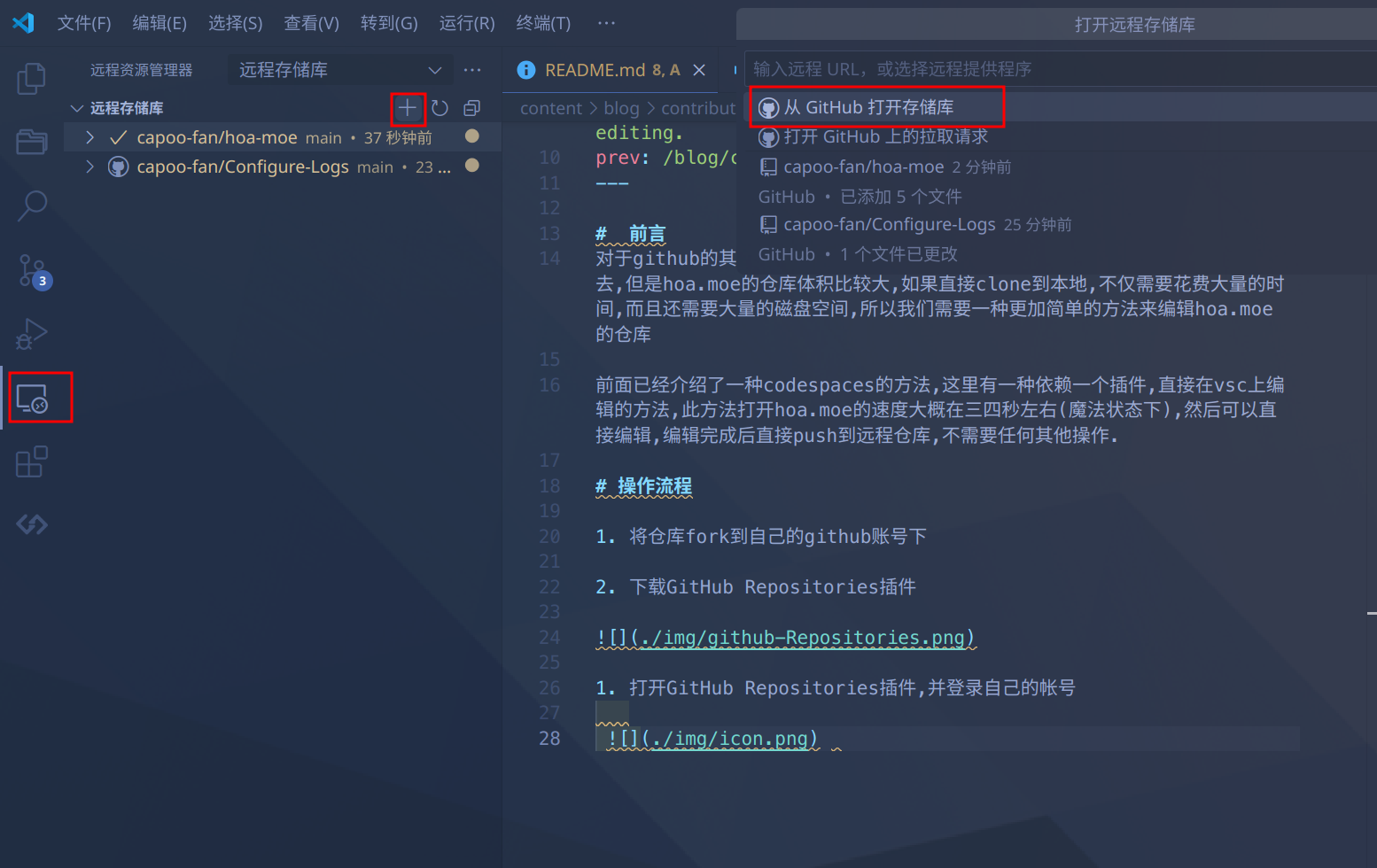 为解决 git clone 因仓库体积过大而失败的问题,前面已经介绍了一种使用 Codespaces 的方法。除此之外,潜伏 还发现一种依赖一个插件,直接在 VS Code 上编辑的方法。使用此方法打开 hoa-moe 仓库仅需几秒(魔法状态下);无需 本地文件 即可编辑仓库,并可直接将修改 push 到远程仓库,非常方便。